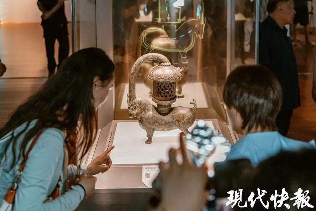 实体文物展区最吸睛的,莫过于空降淮安的南京博物院两大“网红顶流”文物,吸引了一大波游客围观。“小粉炉”——清乾隆芙蓉石蟠螭耳盖炉:罕见的芙蓉石材质和精美的蟠螭纹饰,让游客直呼少女心爆棚;古代照明黑科技——东汉错银铜牛灯:不仅造型生动,更暗藏精妙设计,令游客纷纷赞叹古人的智慧。这两件“网红顶流”文物在南京博物院预约一票难求,如今在家门口就能一睹真容,令不少游客惊喜不已。