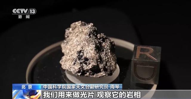 中国科学院国家天文台副研究员 周琴:比较小的岩屑受限于尺寸或者重量,我们能做的一些科学分析是比较有限的,所以这个大块我们能够做的科学分析就比较多。像我们这个样品会取下来一部分小的岩屑用来做光片,观察它的岩相,然后做它的矿物成分。另外我们还可以再取一点样品,去做一些元素精度比较高的定量的工作,包括它的元素的化学成分、同位素的成分,都是可以同时做,相当于对同一个样品从不同的维度去看它、去解译它,但是对小的样品颗粒,我们没有办法同时从多个维度去解译。